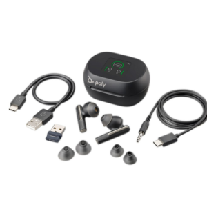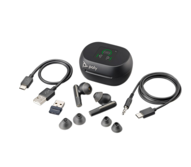 – Smart charging case powered by Poly LaunchPad technology, LCD touch display and Qi wireless charging