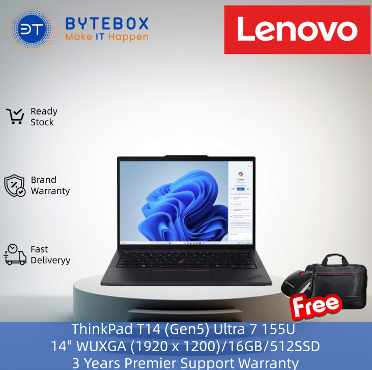 ThinkPad T14 (Gen5) Ultra 7 155U/14″ WUXGA (1920 x 1200)/16GB/512SSD /3 Yrs Premier Support/FREE mouse+bag【Bytebox】
