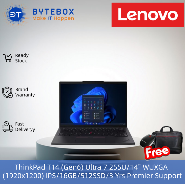 ThinkPad T14 (Gen6) Ultra 7 255U/14″ WUXGA (1920×1200) IPS/16GB/512SSD/3 Yrs Premier Support/FREE mouse+bag【Bytebox】